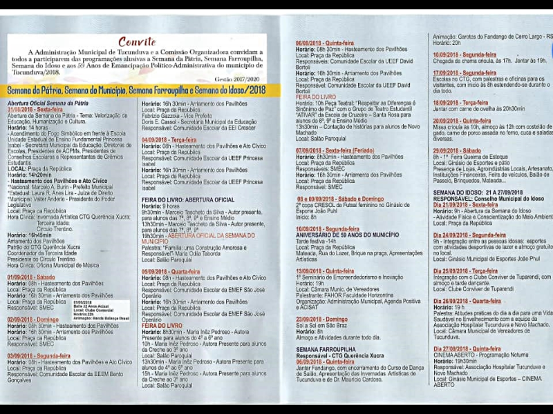 O mês de Setembro é sempre de muitas comemorações e festejos em Tucunduva. Durante o nono mês do ano se comemora a Semana da Pátria, o aniversário do município, a Semana Farroupilha e a Semana do Idoso. A Abertura da Semana da Pátria já acontece no dia 31 de agosto, as 14 horas na Praça da República, com a presença de diversas autoridades e apresentações de entidades. Nos dias 4, 5 e 6 de Setembro será realizada a já tradicional Feira do Livro no Salão Paroquial Católico. No dia 6 de Setembro, acontece a abertura da Semana Farroupilha com um jantar fandango no CTG Querencia Xucra. No dia 10 de Setembro, chegada da chama crioula. Nos dias 8 e 9 de Setembro, será realizada a Segunda Copa Cresol de Futsal Feminino no Ginásio Municipal de Esportes João Puhl. No dia 10 de Setembro, Tucunduva comemora 59 anos de emancipação político-administrativa, onde será a tarde festiva na Praça da República com mateada, rua do lazer, brique na praça e apresentações artísticas. No dia 21 de Setembro, acontece a abertura da Semana do Idoso. A programação completa pode ser conferida no folder, na imagem abaixo. Venha e participa das atividades comemorativas do mês de Setembro em Tucunduva.
