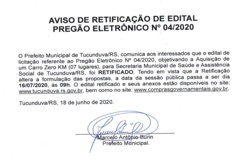O Município de Tucunduva/RS, comunica aos interessados que o edital de licitação referente ao Pregão Eletrônico N° 04/2020 que tem como objetivo a Aquisição de um Carro Zero KM (07 lugares), foi RETIFICADO. Tendo em vista que a Retificação altera a formulação das propostas, a data da sessão pública passa a ser dia 16/07/2020, as 09h, exclusivamente no site: https://www.comprasgovernamentais.gov.br/. O edital retificado e seus anexos estarão disponíveis no seguinte link: https://www.tucunduva.rs.gov.br//site/licitacoes/21303-preg. Mais informações pelo e-mail: licitacao@tucunduva.rs.gov.br ou pelo telefone (55) 3542 1022.