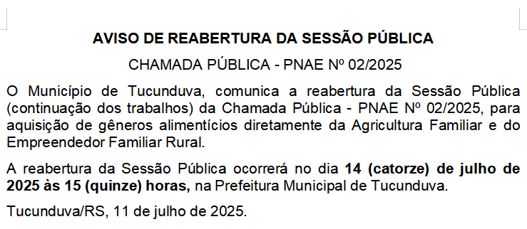 O Município de Tucunduva, comunica a reabertura da Sessão Pública (continuação dos trabalhos) da Chamada Pública - PNAE Nº 02/2025, para aquisição de gêneros alimentícios diretamente da Agricultura Familiar e do Empreendedor Familiar Rural.