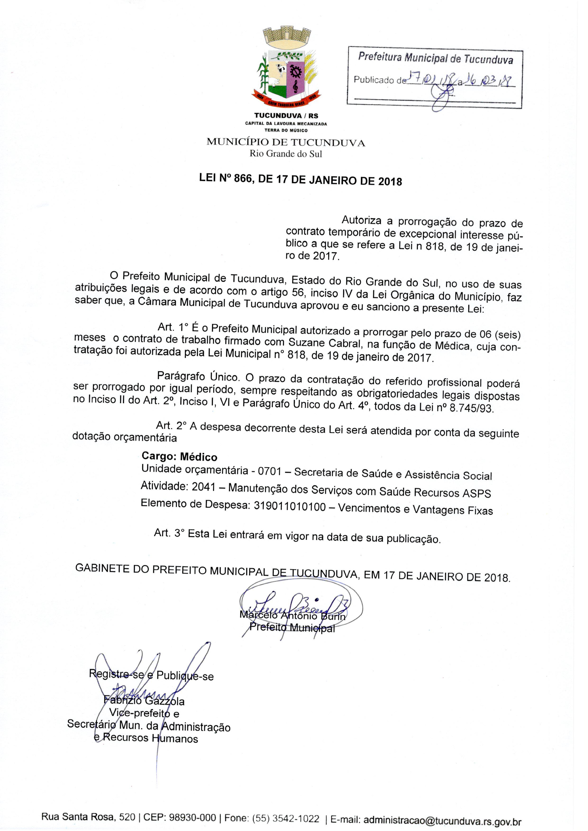LEI N° 866 DE 17 DE JANEIRO DE 2018.AUTORIZA A PRORROGAÇÃO DO PRAZO DE CONTRATO TEMPORÁRIO DE EXCEPCIONAL INTERESSE PÚBLICO.