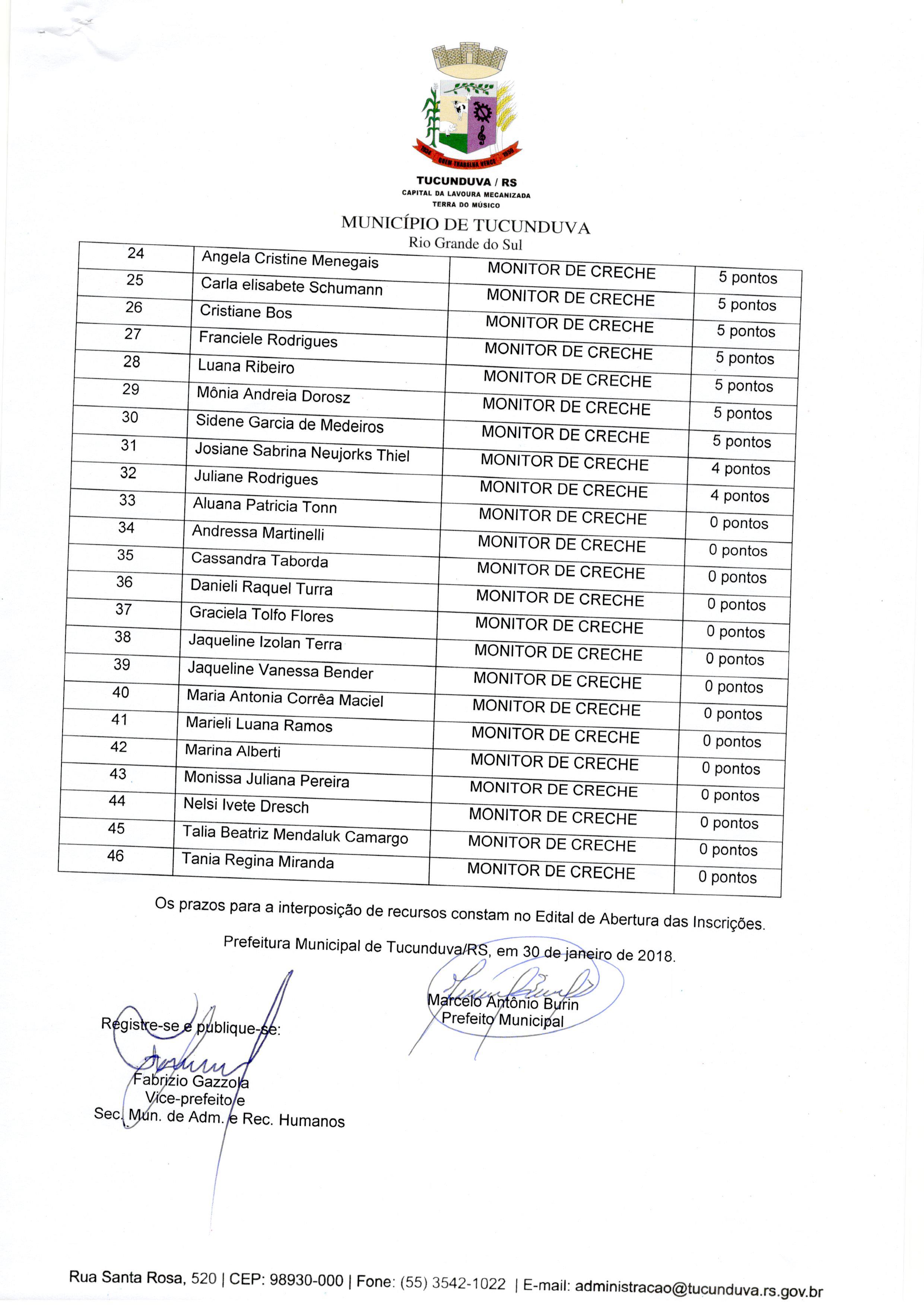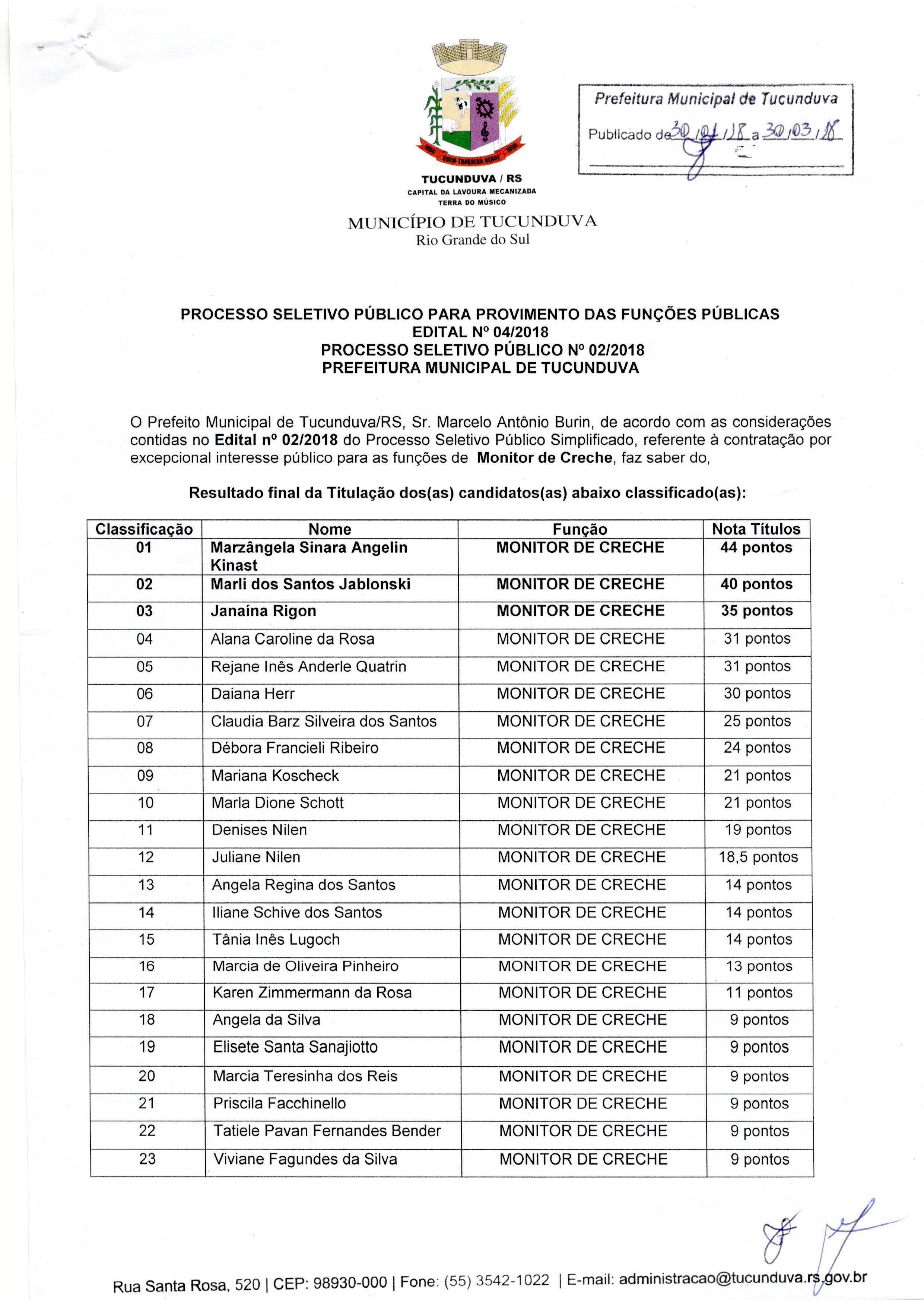 CLASSIFICAÇÃO DE PROCESSO SELETIVO PARA CONTRATAÇÃO TEMPORÁRIA DE MONITOR DE CRECHE. EDITAL Nº 04 DE 2018 .