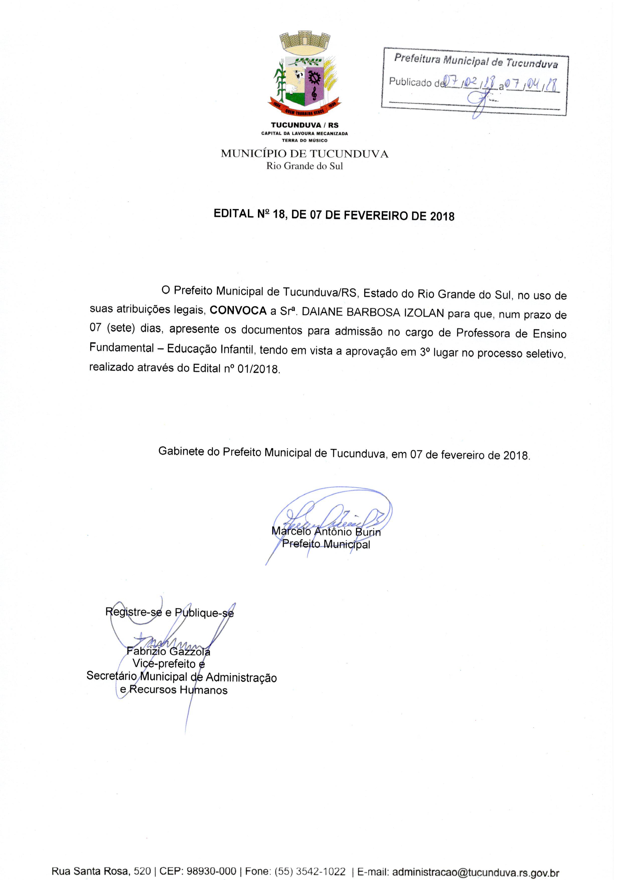 O Prefeito Municipal de Tucunduva /RS,Estado do Rio Grande Do Sul no sua de suas atribuições legais conva a Srº Daiane Barbosa Izolan.