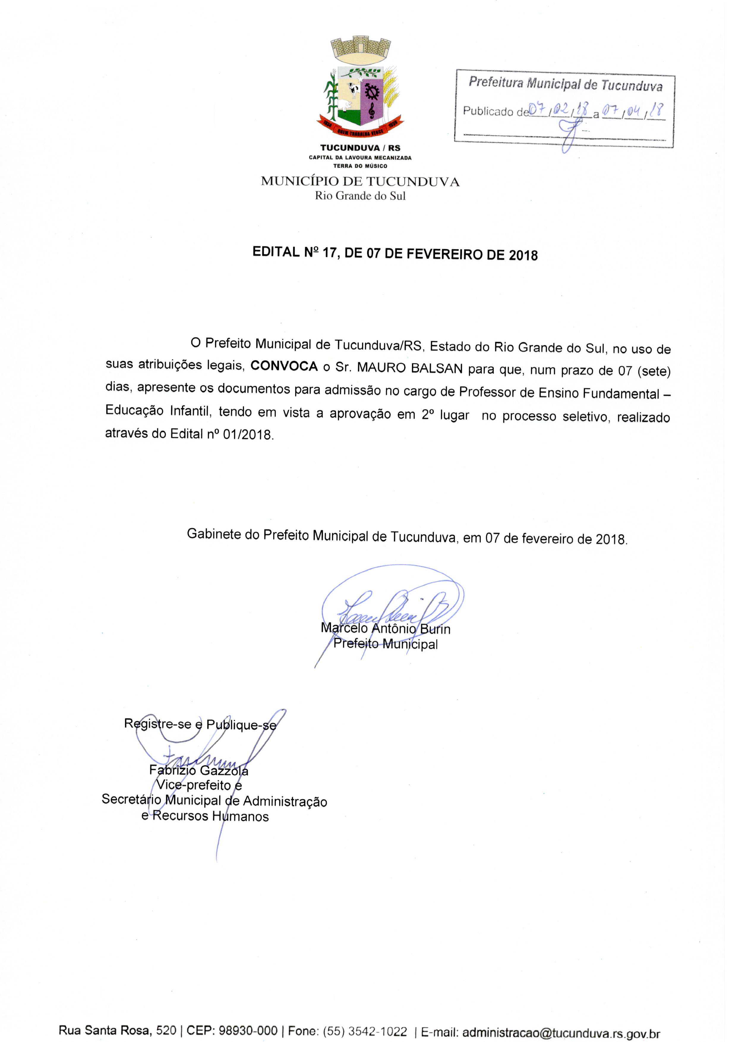 O Prefeito Municipal de Tucunduva /RS,Estado do Rio Grande Do Sul no sua de suas atribuições legais conva a Srº Mauro Balsan.