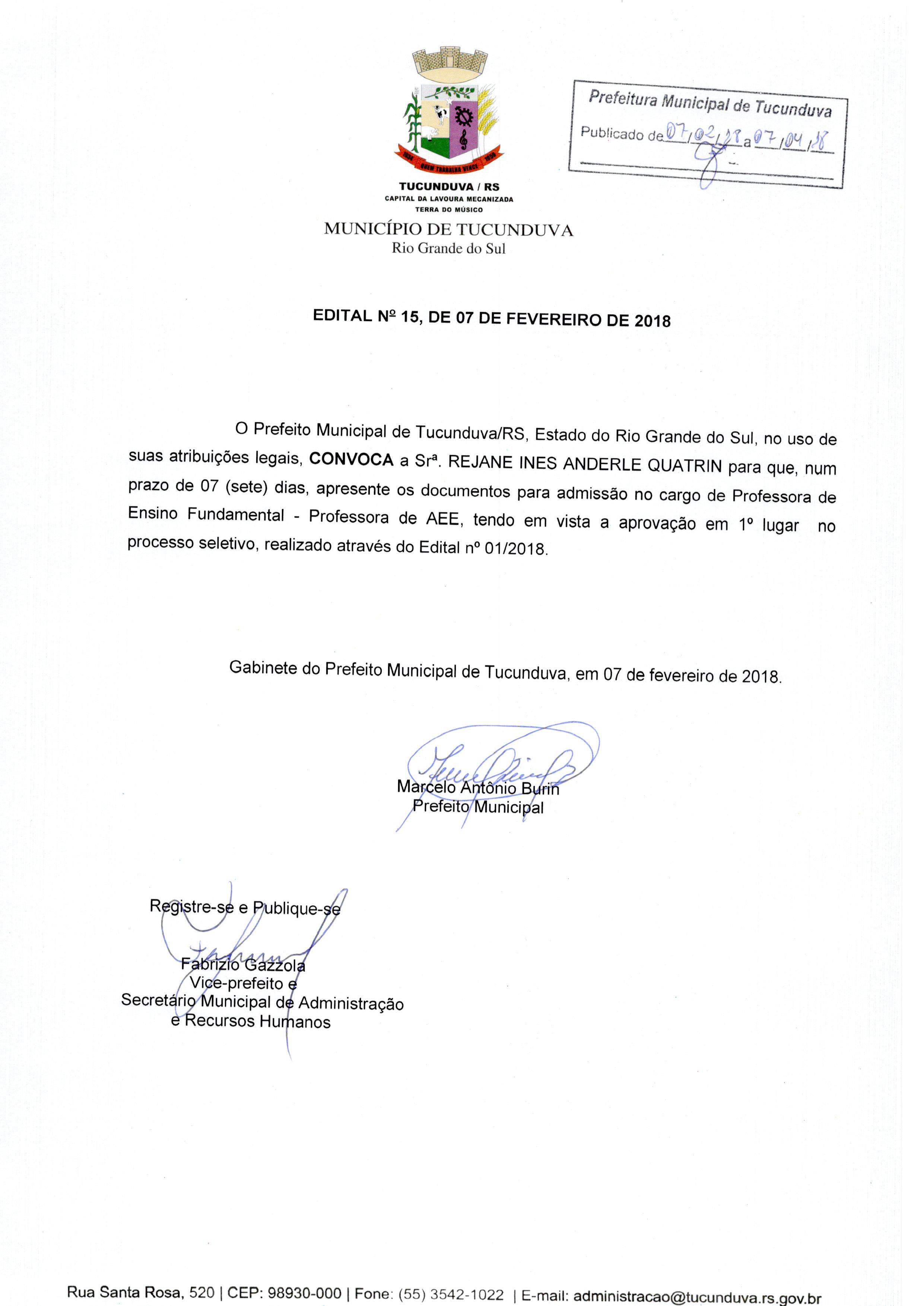 O Prefeito Municipal de Tucunduva /RS,Estado do Rio Grande Do Sul no sua de suas atribuições legais conva a Srº Rejane Inês Anderle Quatrin.
