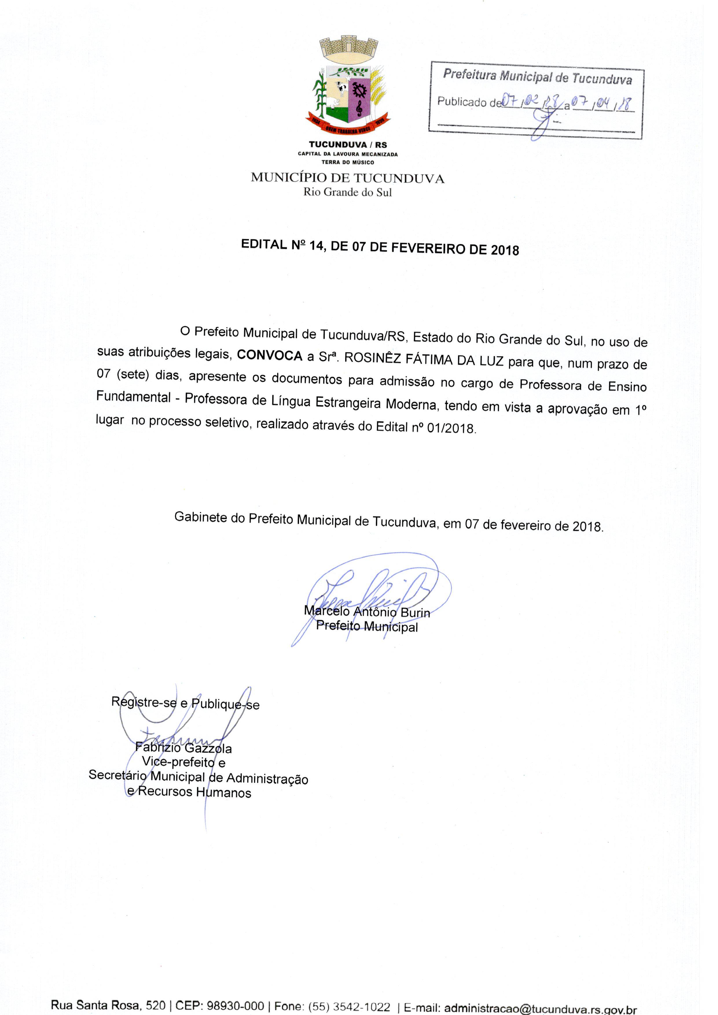 O Prefeito Municipal de Tucunduva /RS,Estado do Rio Grande Do Sul no sua de suas atribuições legais conva a Srº Rosinês Fatima da Luz.