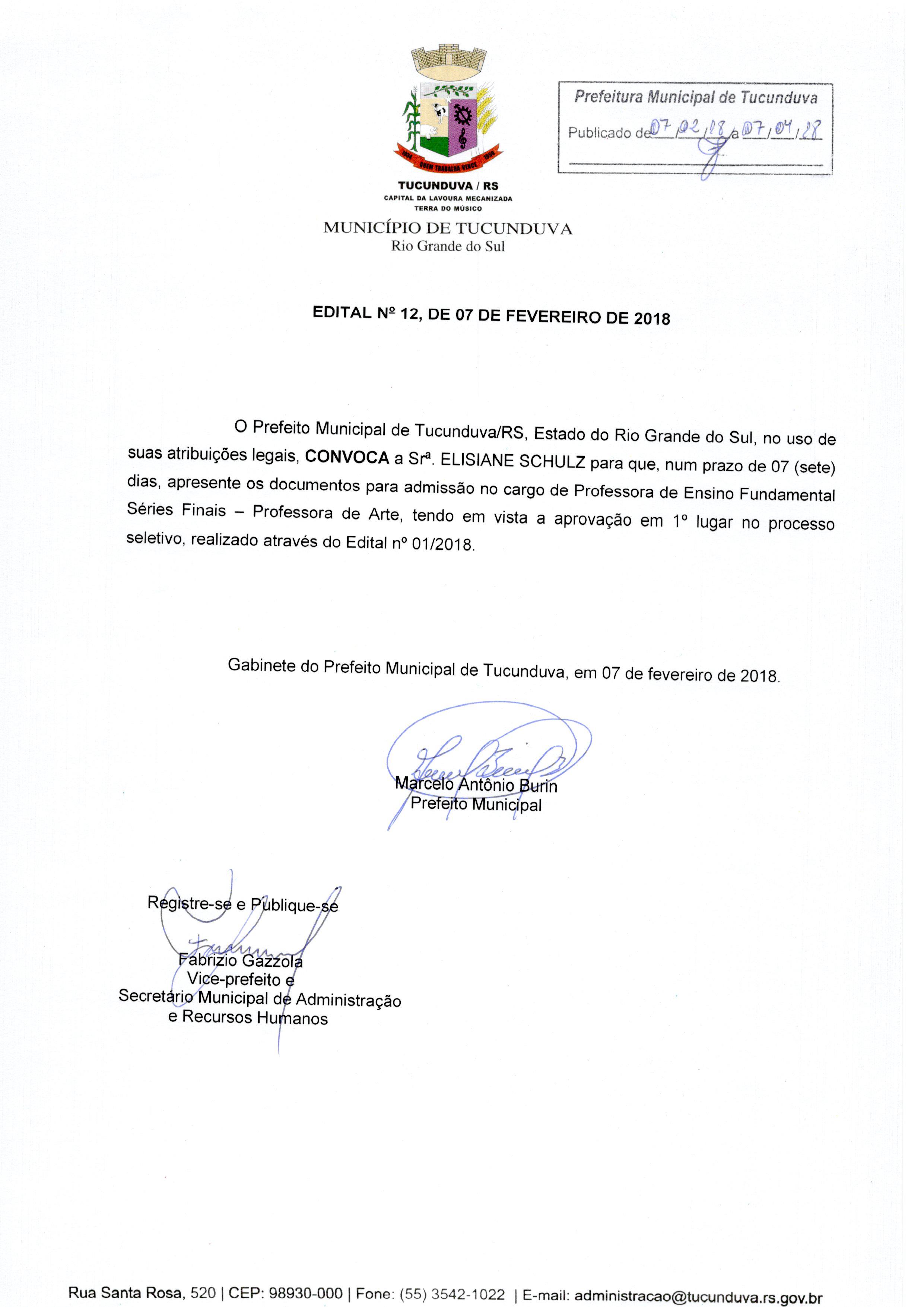 O Prefeito Municipal de Tucunduva /RS,Estado do Rio Grande Do Sul no sua de suas atribuições legais conva a Srº Elisiane Schulz.