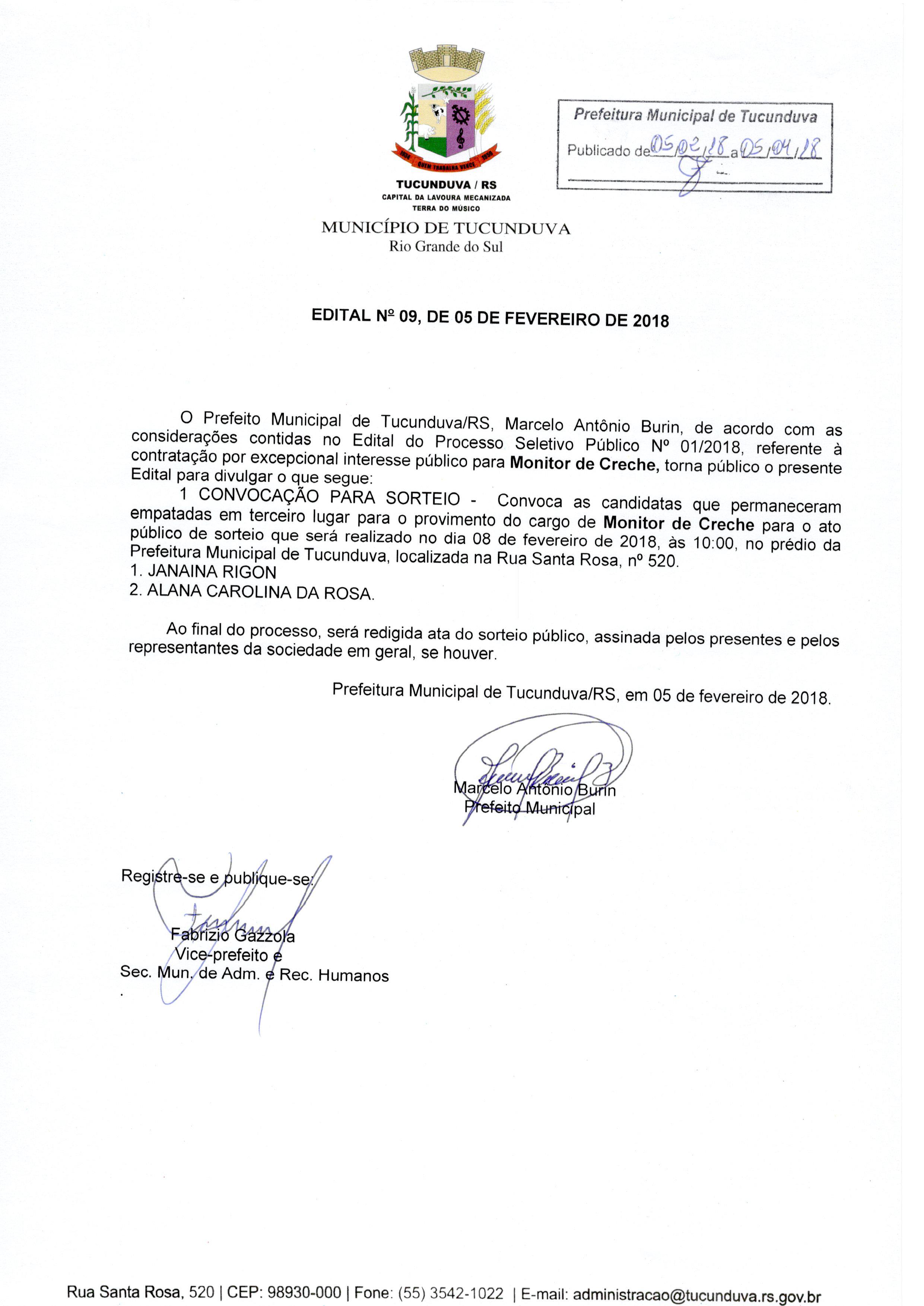 O Prefeito Municipal de Tucunduva /RS,Estado do Rio Grande Do Sul no sua de suas atribuições legais conva a Srº Janaina Rigon e o Srº Alana Carolina da Rosa para o sorteio dos candidatos que permancem empatados em 1º lugar no Processo Seletivo de professor.