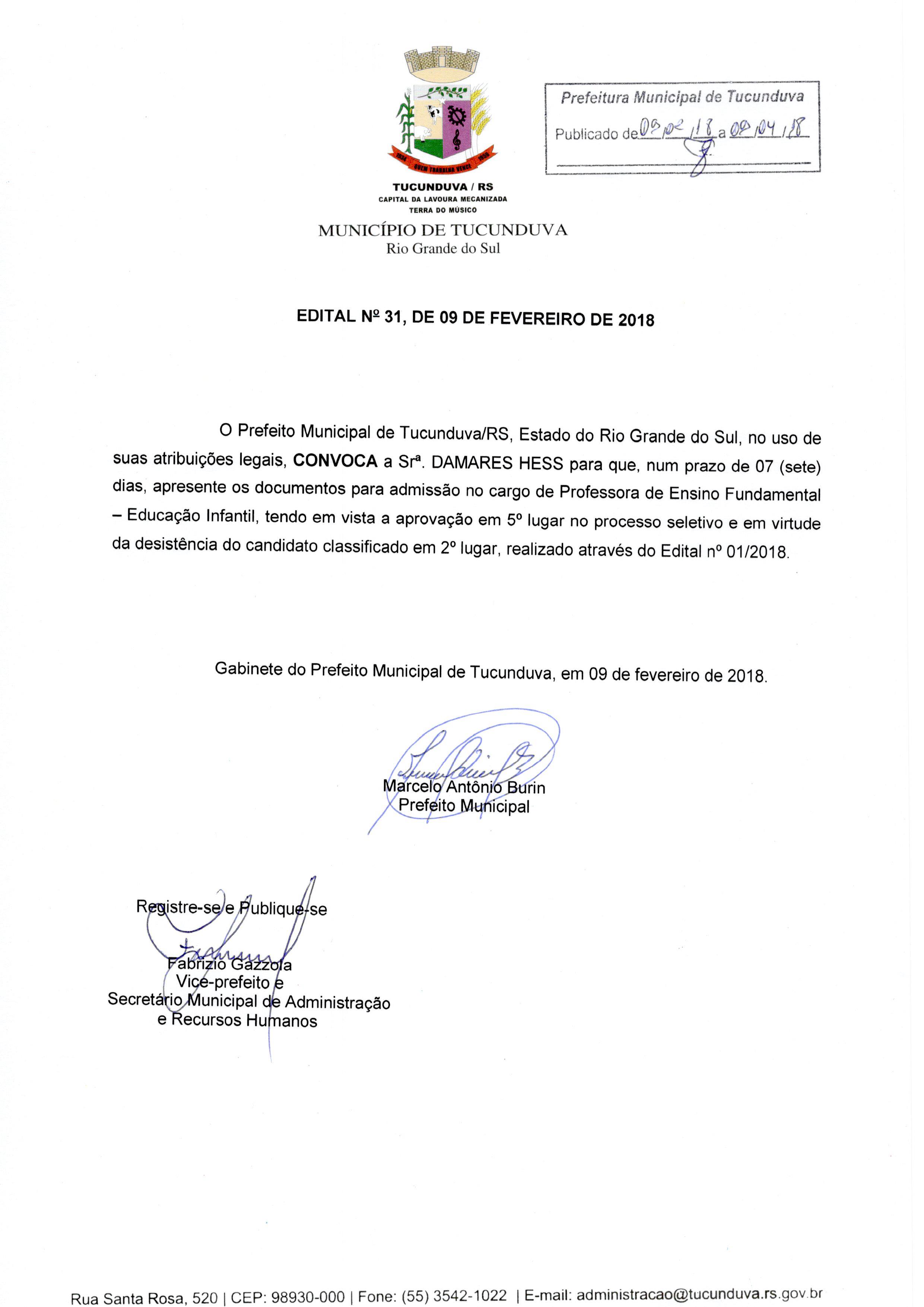 EDITAL N° 31 DE 09 DE FEVEREIRO DE 2018.