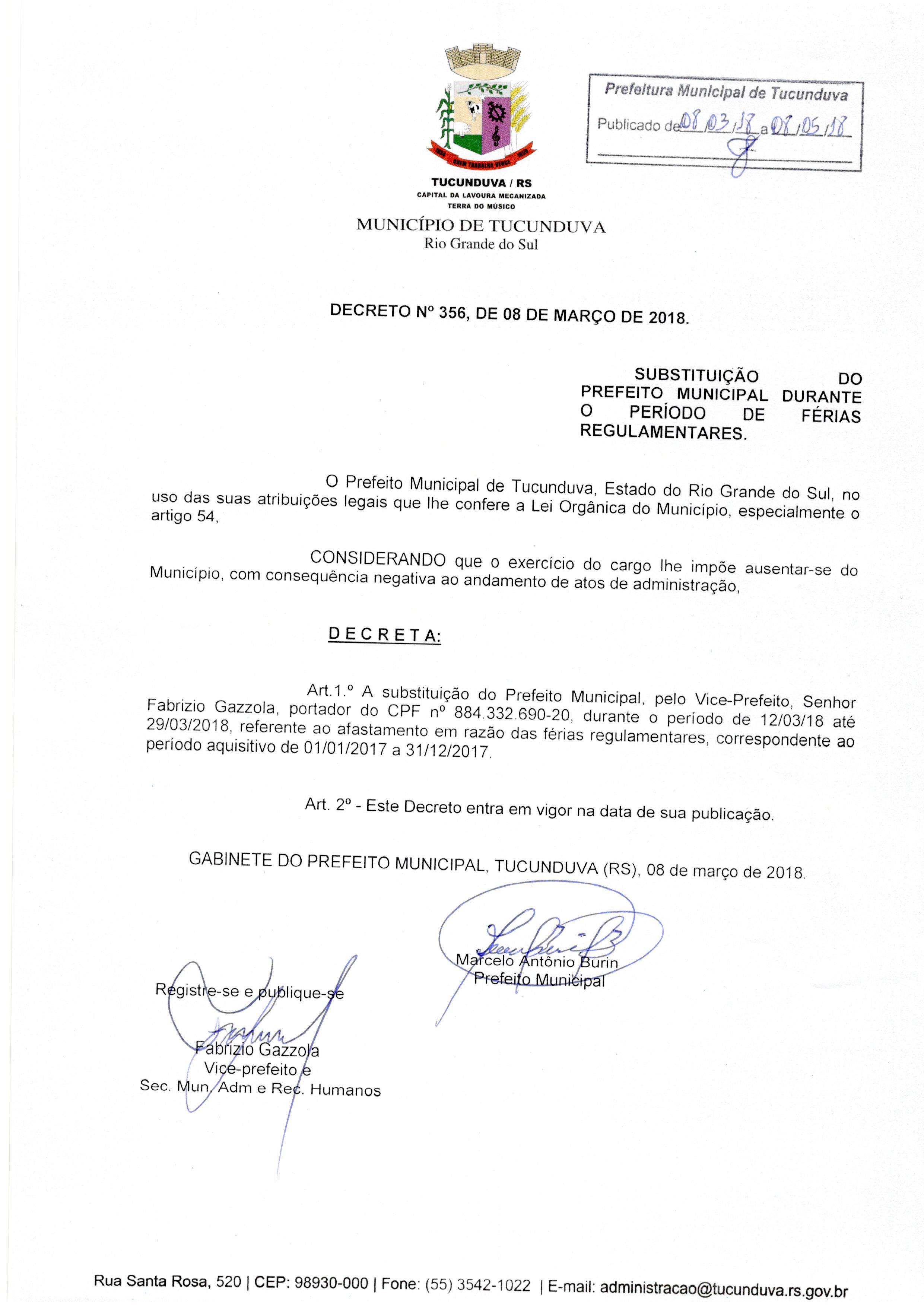 DECRETO Nº 356 DE 08 DE MARÇO DE 2018.SUBSTITUI O PREFEITO MUNICIPAL DURANTE PERÍODO DE FÉRIAS.