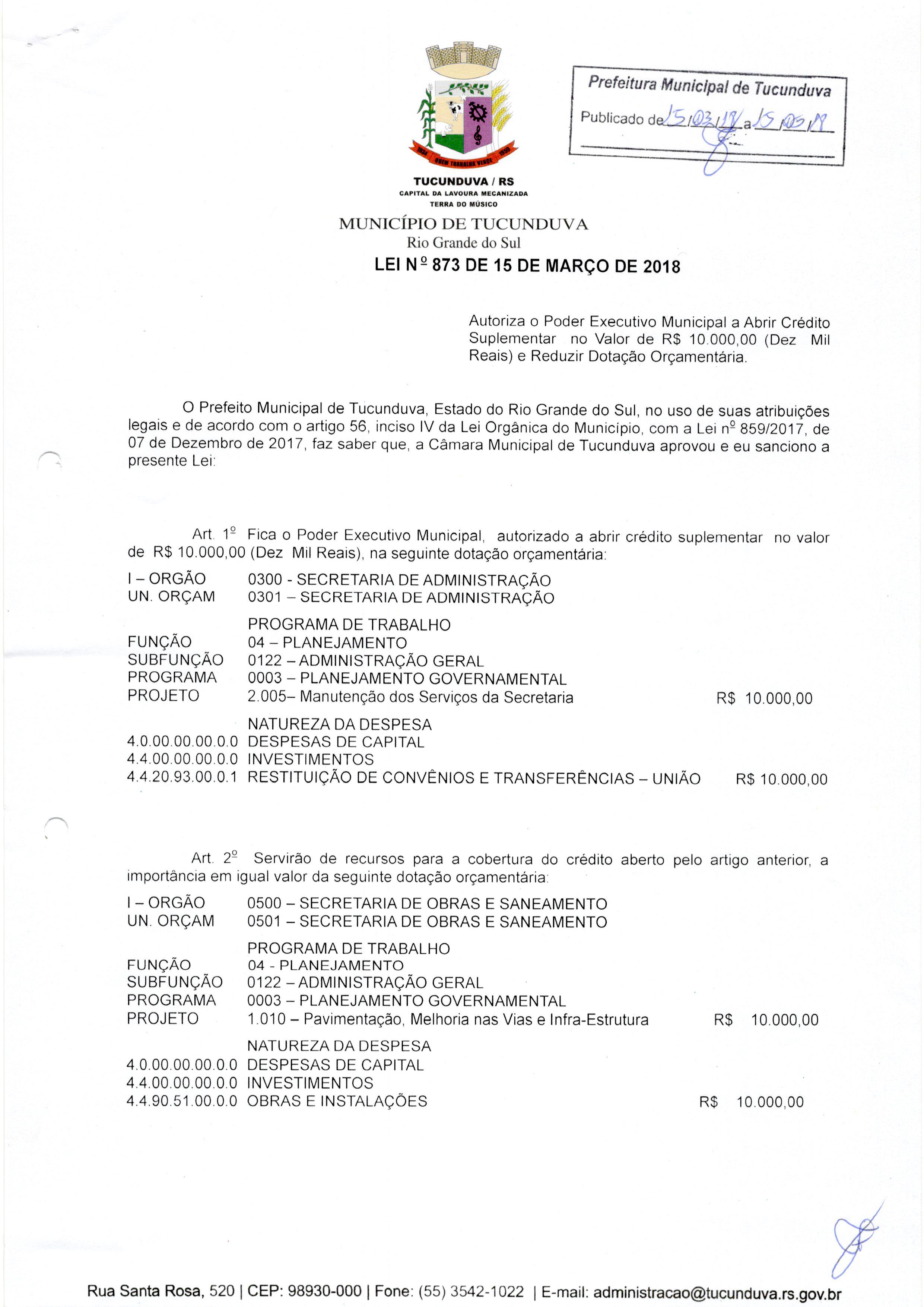 LEI Nº 873 DE 15 DE MARÇO DE 2018.AUTORIZA O PODER EXECUTIVO A ABRIR CRÉDITO SUPLEMENTAR.