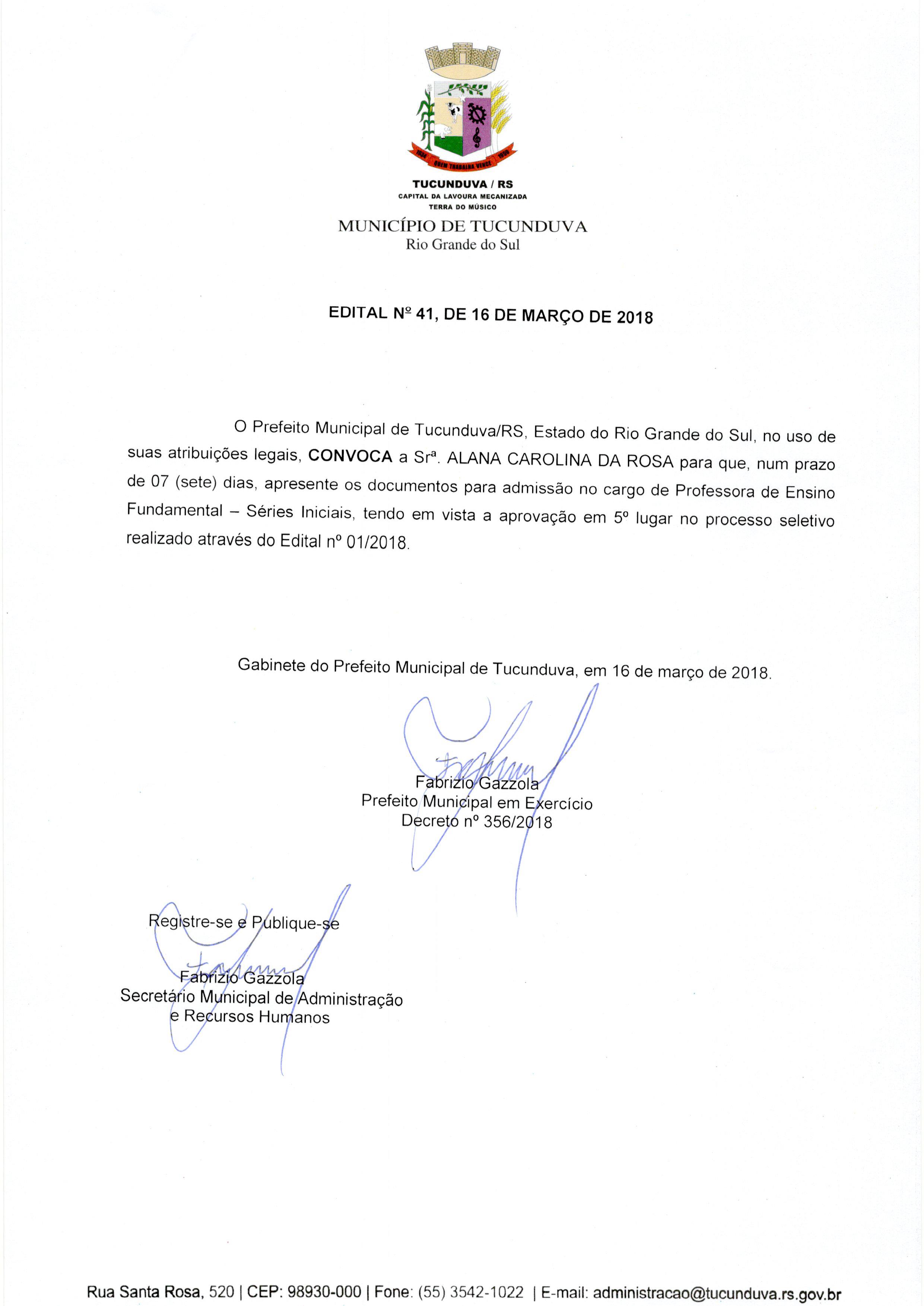 O PREFEITO MUNICIPAL CONVOCA SENHORA ALANA CAROLINA DA ROSA.
