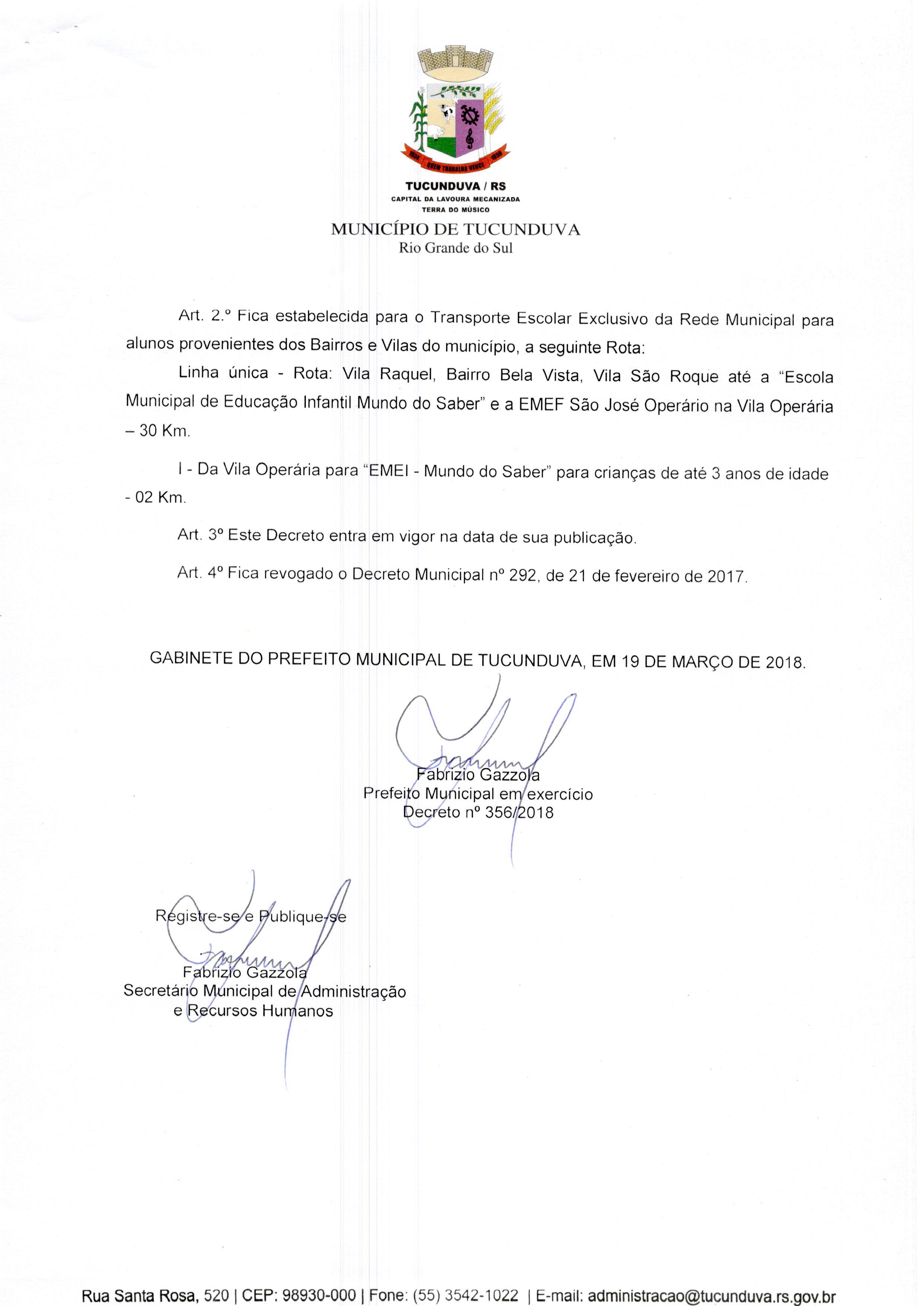 DECRETO Nº 360 DE 19 DE MARÇO DE 2018.ESTABELECE ROTEIRO DO TRANSPORTE ESCOLAR.