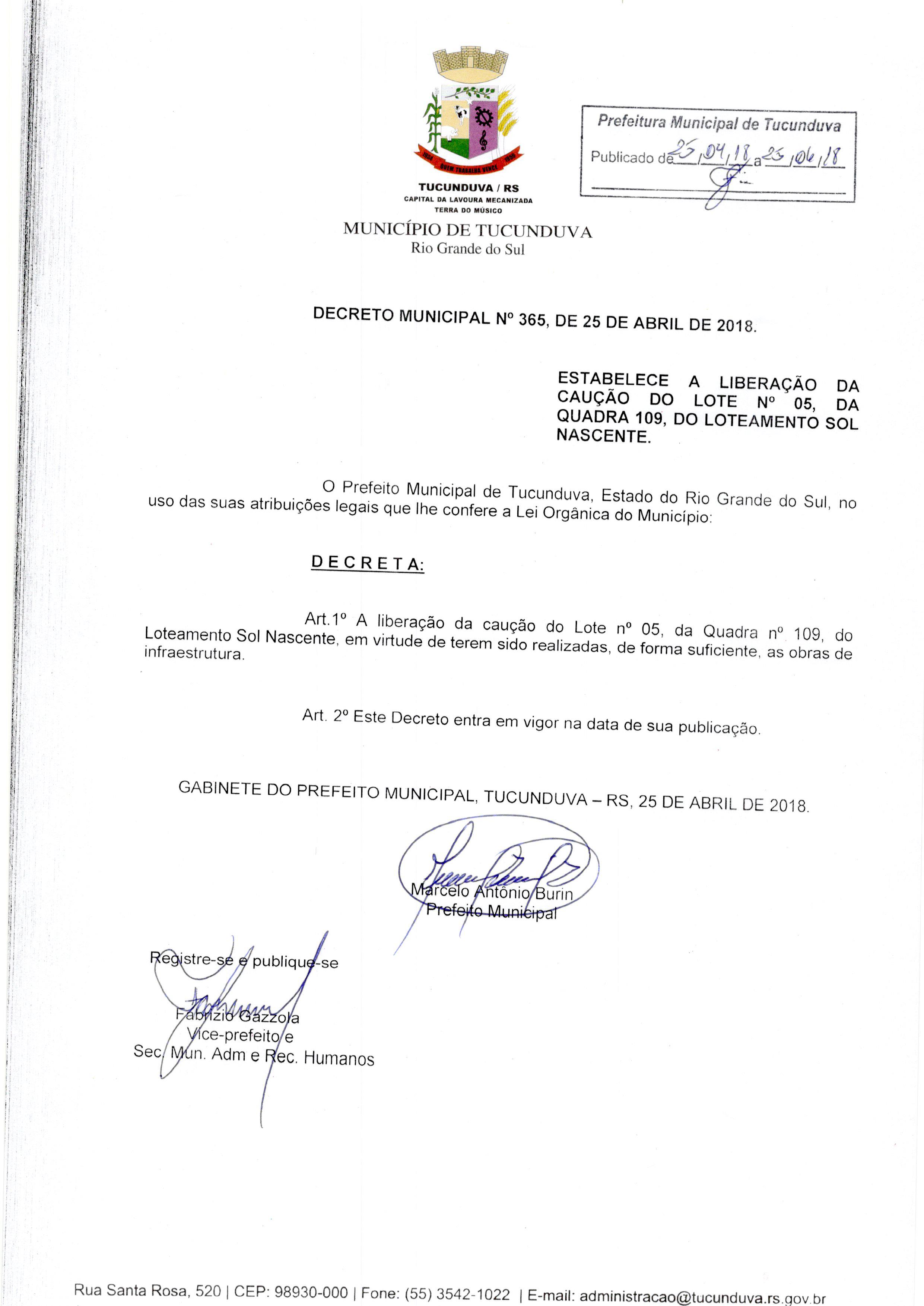 DECRETO MUNICIPAL Nº 365 DE 25 DE ABRIL DE 2018.ESTABELECE A LIBERAÇÃO DA CAUÇÃO DO LOTE Nº 05 DA QUADRA 109 DO LOTEAMENTO SOL NASCENTE.