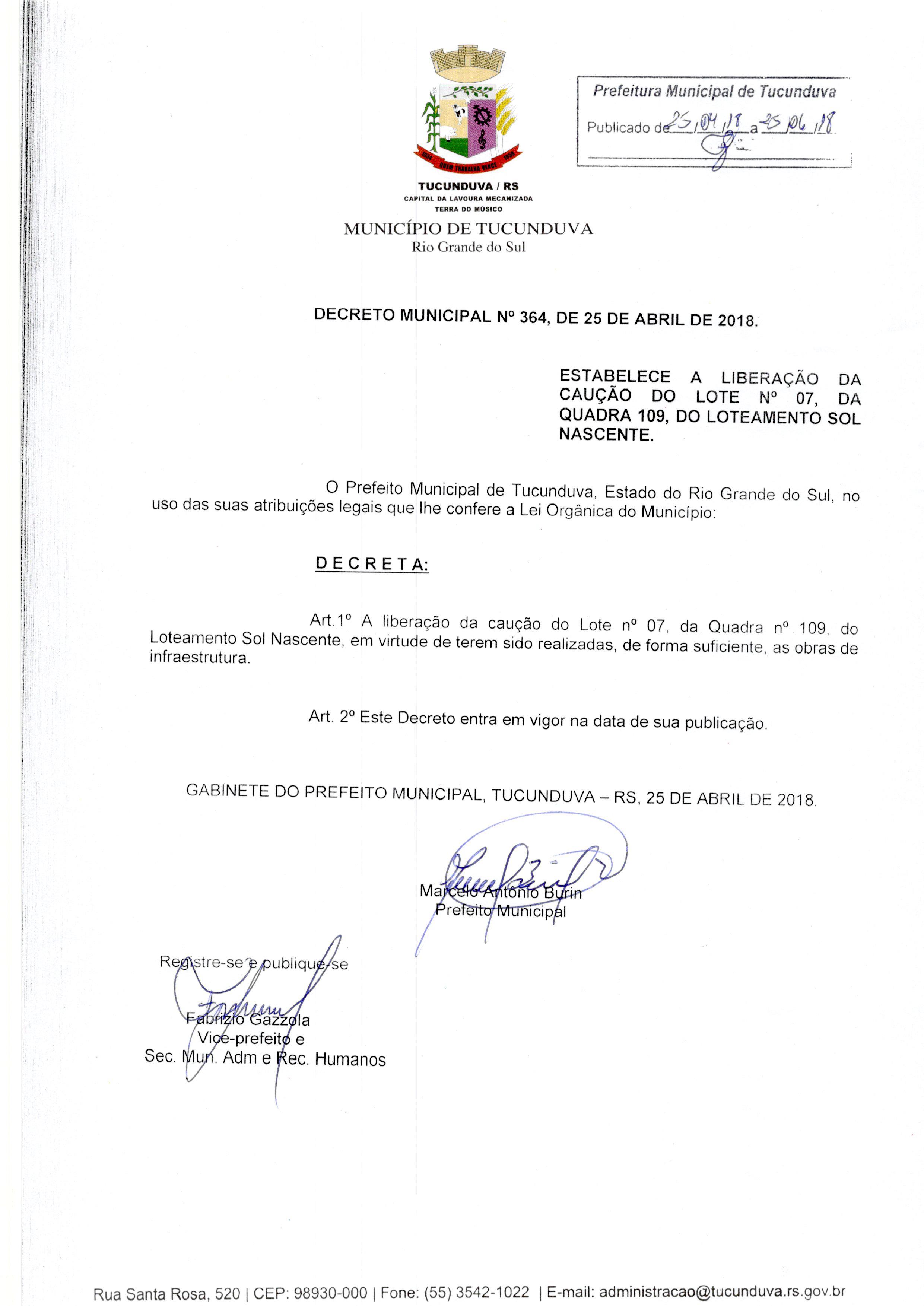 DECRETO MUNICIPAL Nº 364 DE 25 DE ABRIL DE 2018.ESTABELECE A LIBERAÇÃO DA CAUÇÃO DO LOTE Nº 07 DA QUADRA 109 DO LOTEAMENTO SOL NASCENTE.