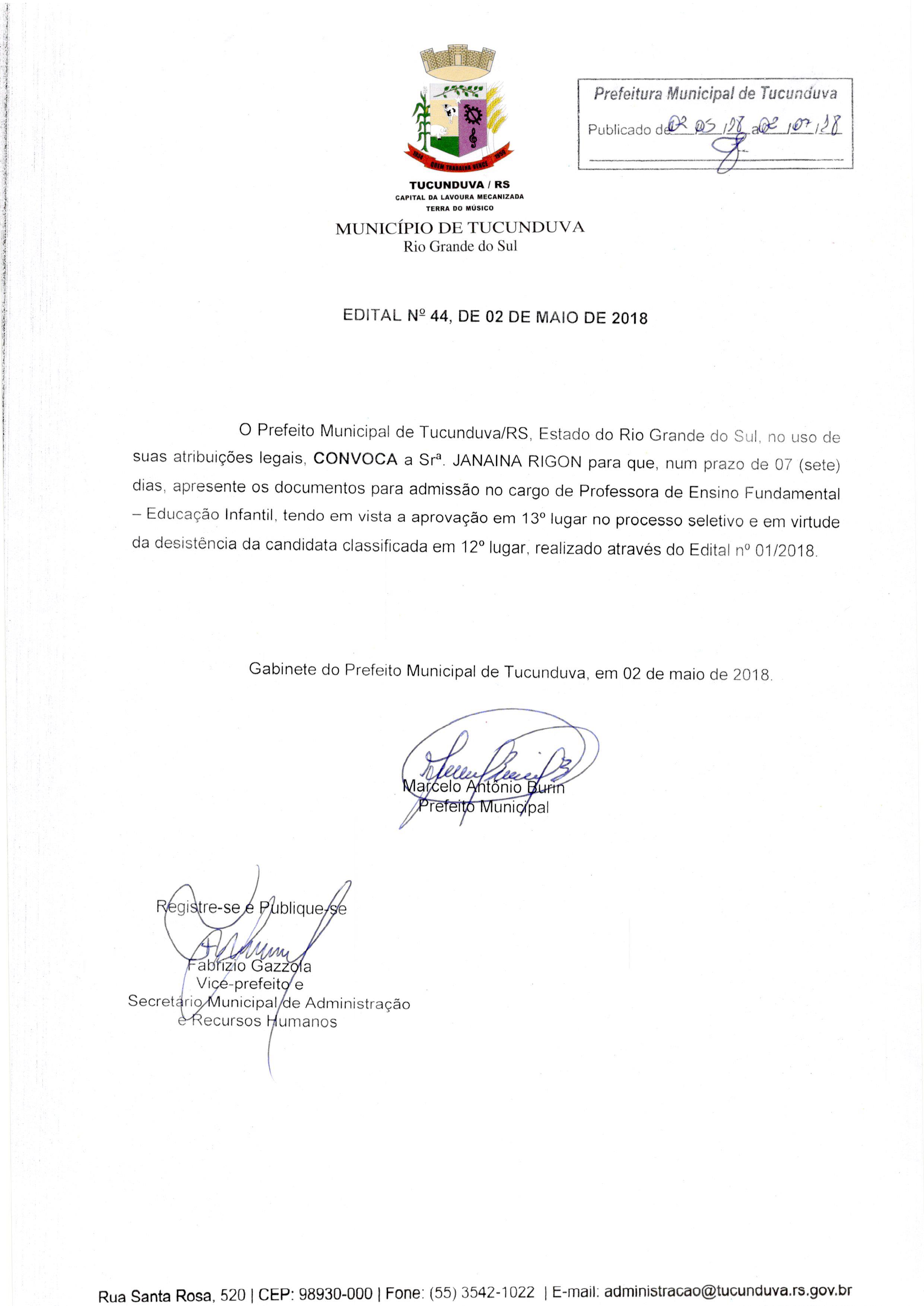EDITAL Nº 44 DE 02 DE MAIO DE 2018,O PREFEITO MUNICIPAL NO USO DE SUAS ATRIBUIÇÕES LEGAIS CONVOCA Sr. JANAINA RIGON.