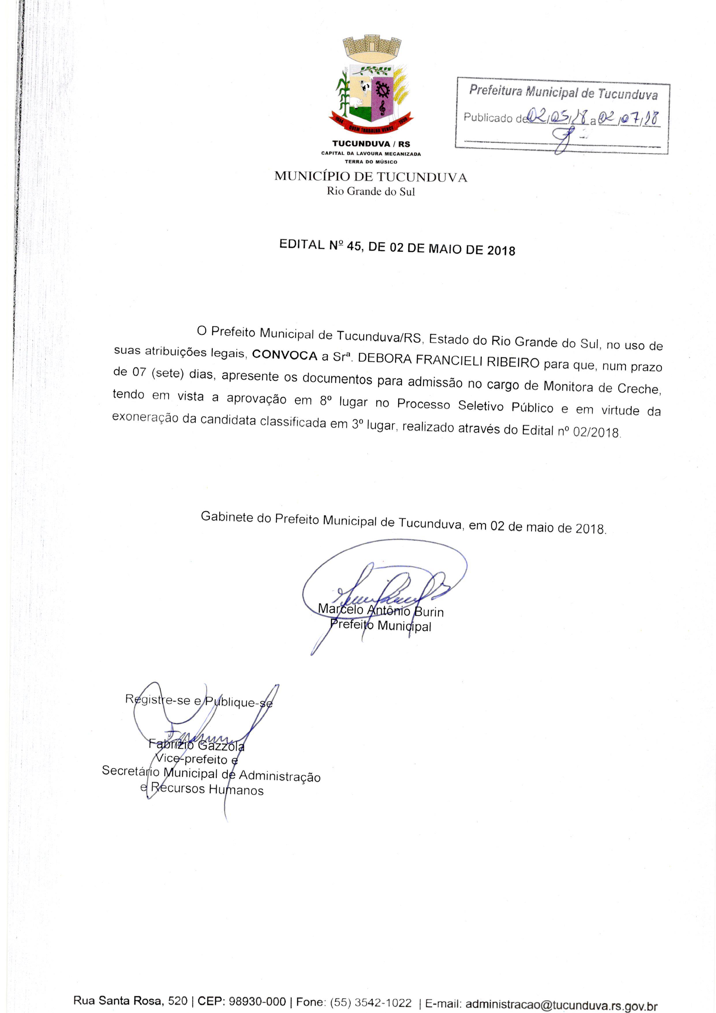EDITAL Nº 45 DE 02 DE MAIO DE 2018,O PREFEITO MUNICIPAL NO USO DE SUAS ATRIBUIÇÕES LEGAIS CONVOCA Sr. DEBORA FRANCIELI RIBEIRO.