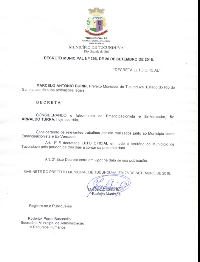 DECRETO MUNICIPAL Nº 396 DE 26 DE SETEMBRO DE 2018.DECRETA LUTO OFICIAL.