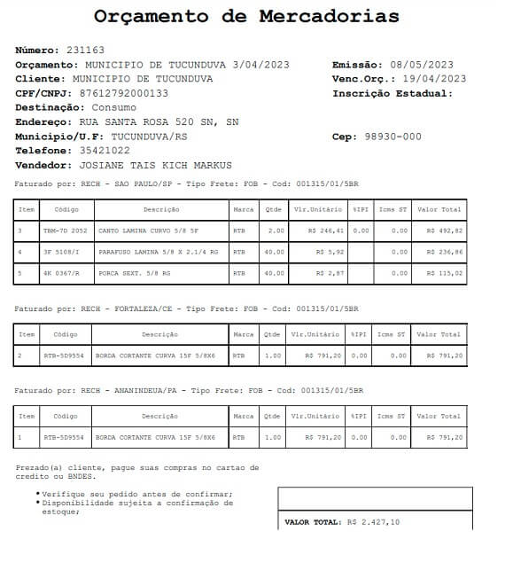 DESBRAVADOR COMERCIO DE PEÇAS, MECÂNICA E TRANSPORTES LTDA. CNPJ 18.045.972/0001-68. VALOR: R$ 1.398,00.